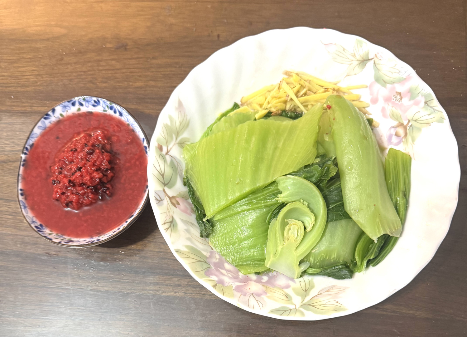 材料:娃娃菜、杏鮑菇、紅蘿蔔、薑。