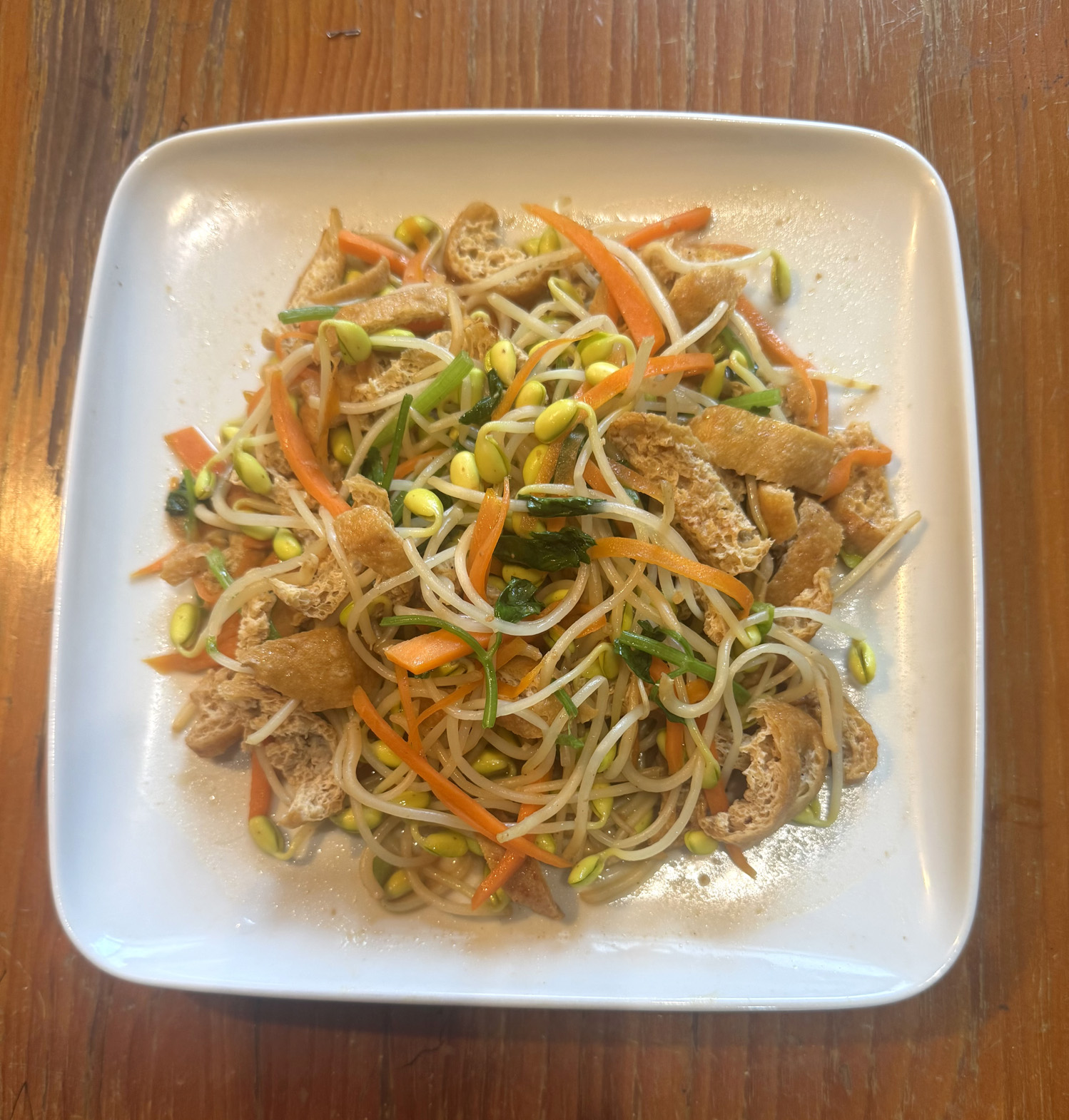 作法:木耳泡開川燙備用,豆包煎兩面黃切成六片、豆芽摘尾,紅蘿蔔切片,青江菜切小段。鍋內放油紅蘿蔔青江菜下鍋拌炒+木耳+豆包+少許素毫油+少許鹽拌炒+少許水+豆芽一起拌炒至熟盛起。