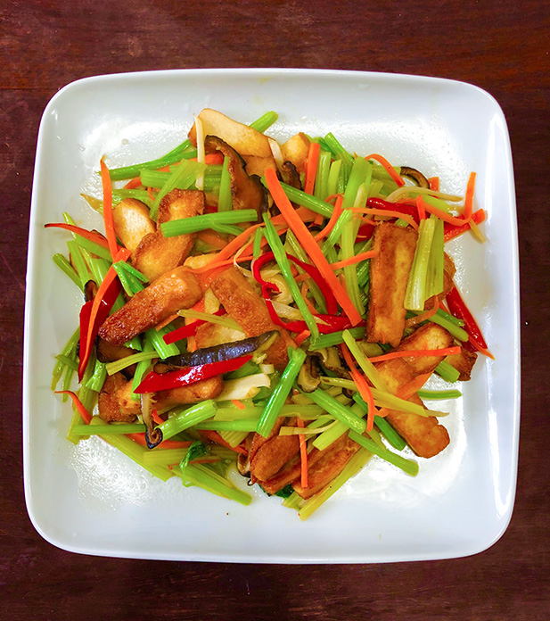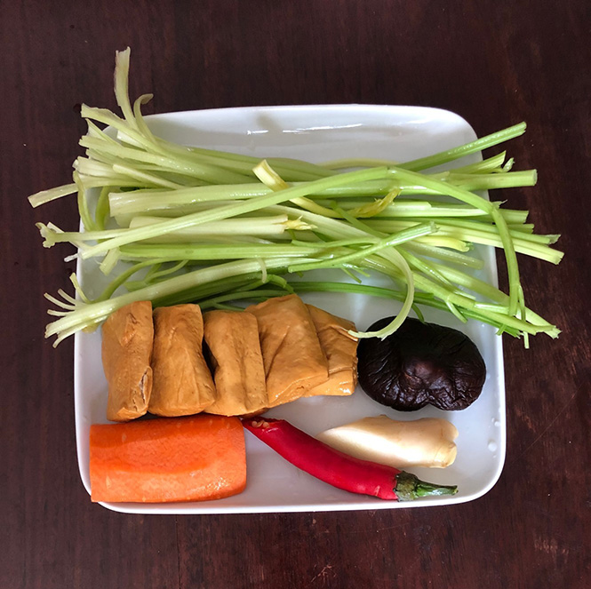客家小炒 Posted on 2021-07-18 by malichuang 回應 材料:芹菜、豆、香菇、紅蘿蔔、薑、辣椒、鹽、香油。作法:先放油將豆干放入,炒至兩面香再下香菇炒香+薑絲辣椒+鹽+豆芽菜大火翻炒+少許水燜煮豆芽熟+香油即可盛起。