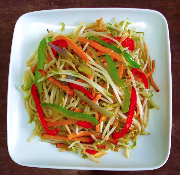 作法:先將麵腸炒香+火腿炒香+四色彩椒+鹽+一點毫油爆香+豆芽大火拌炒+香油起鍋即可。
