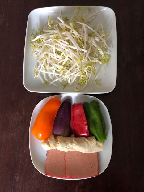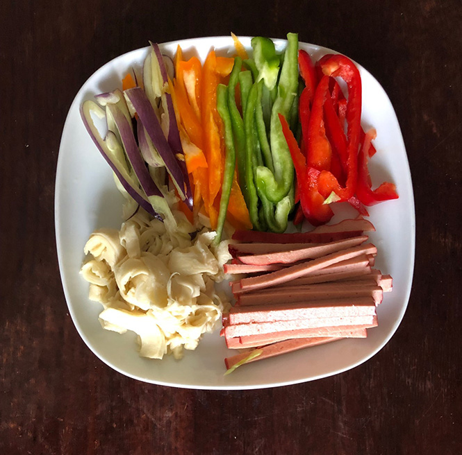 材料:豆芽、4 色彩椒、火腿片、麵腸、小香油。