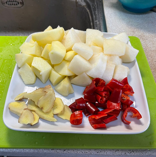 材料:南瓜、馬鈴薯、紅蘿蔔、紅椒、長豆、玉米、皮絲、薑、冰糖、醬油、鹽、素几丁或素鹽酥几都可以。