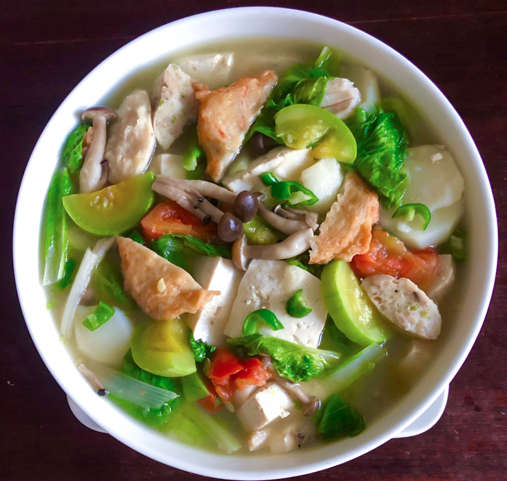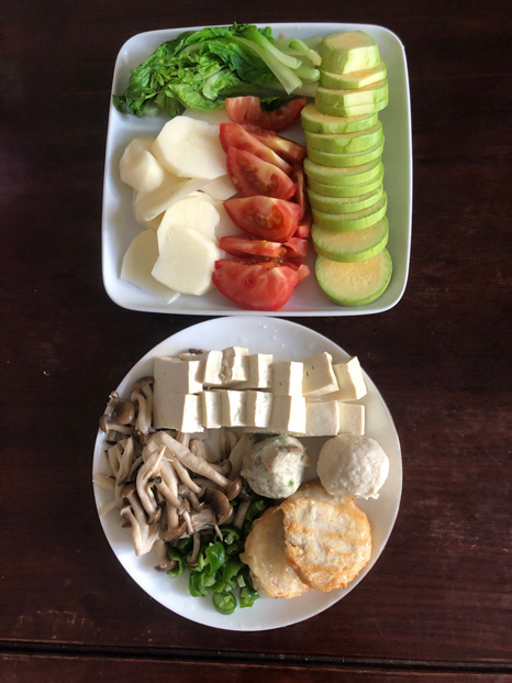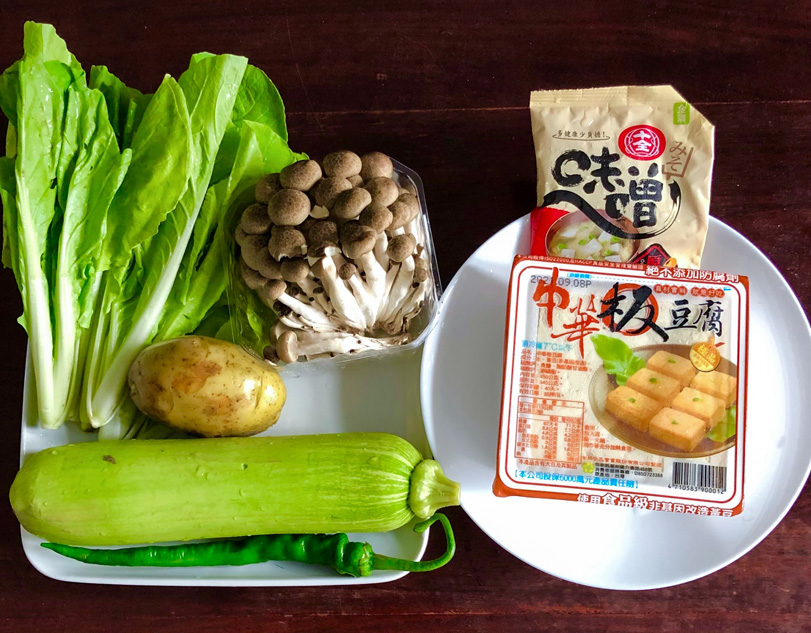 材料:豆腐、馬鈴薯、番茄、櫛瓜、菇、小白菜、味噌、青辣椒、甜不辣、素丸子。