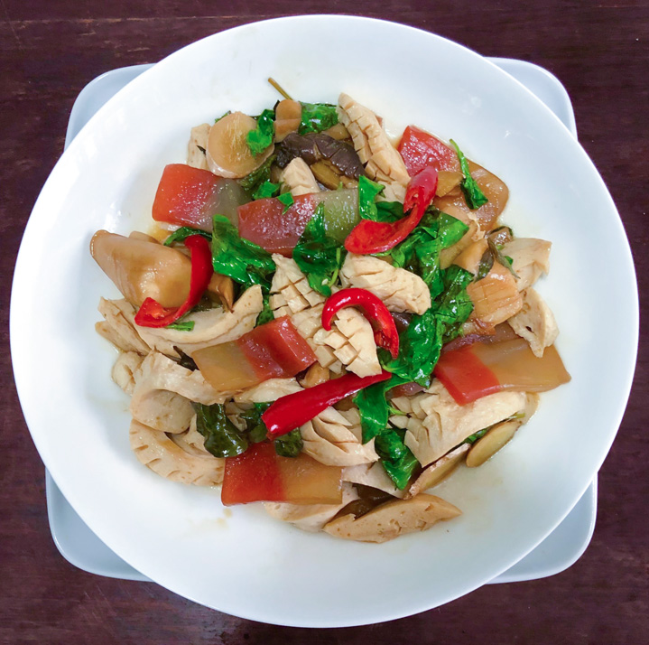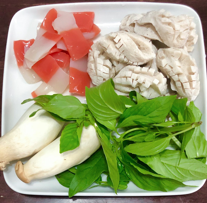 材料:素腰花蒟蒻、杏鮑菇、九層塔、麻油、醬油、素毫油、冰糖。