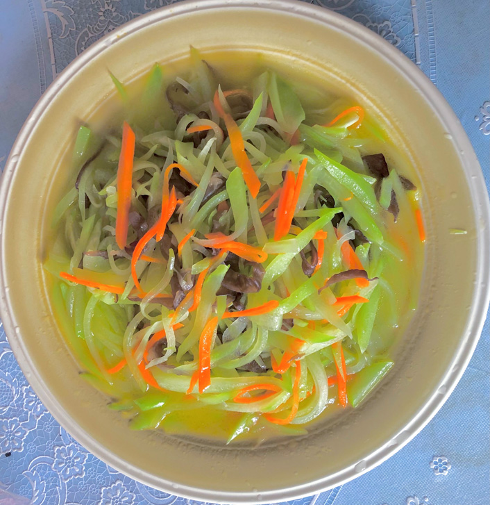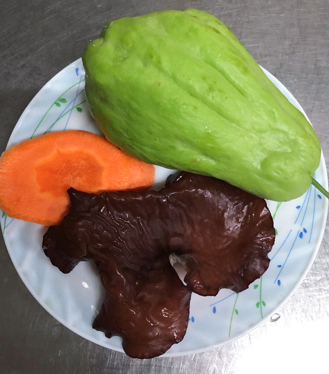 材料: 佛手瓜、紅蘿蔔、木耳。