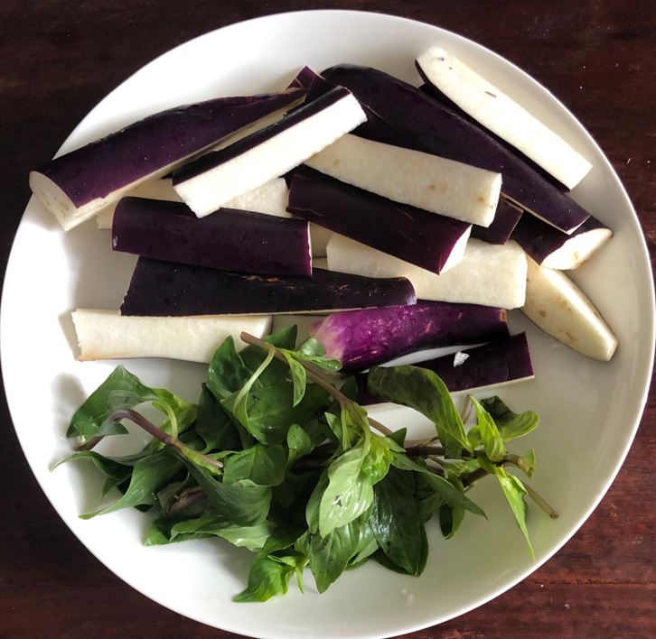 材料:茄子、九層塔、和風醤油、甜辣醬、烏醋。