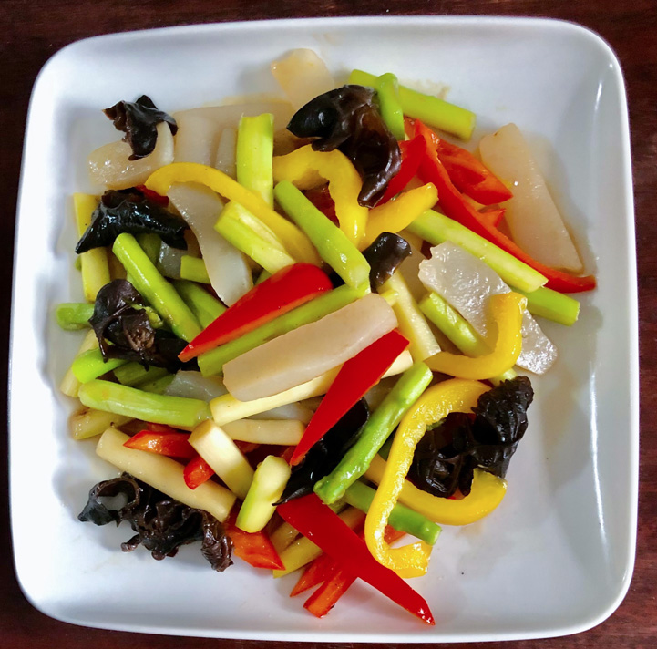 作法:木耳先煮熟撈起,彩椒肉片切條,蘆筍折小段,鍋內放油放下蒟蒻炒+鹽+醬油少許,再將所有的食材一起放入炒熟即可。
