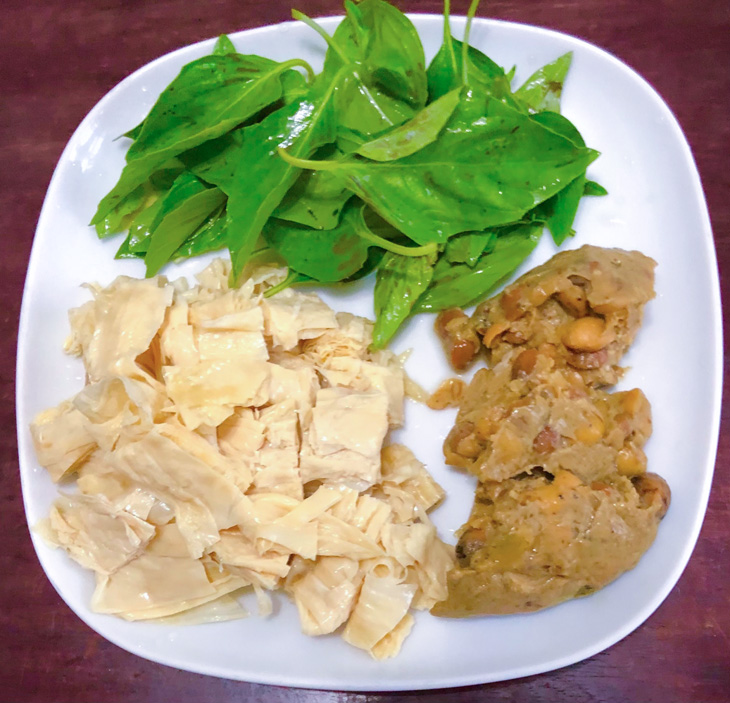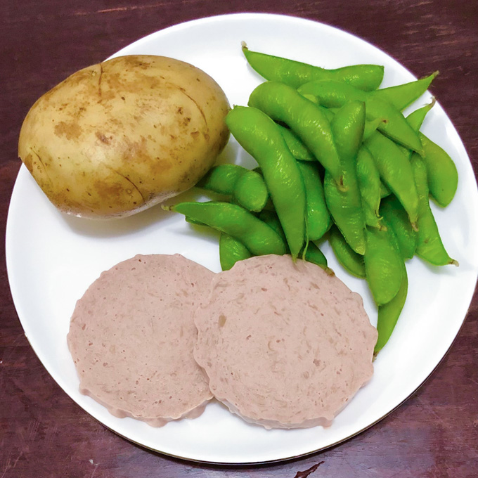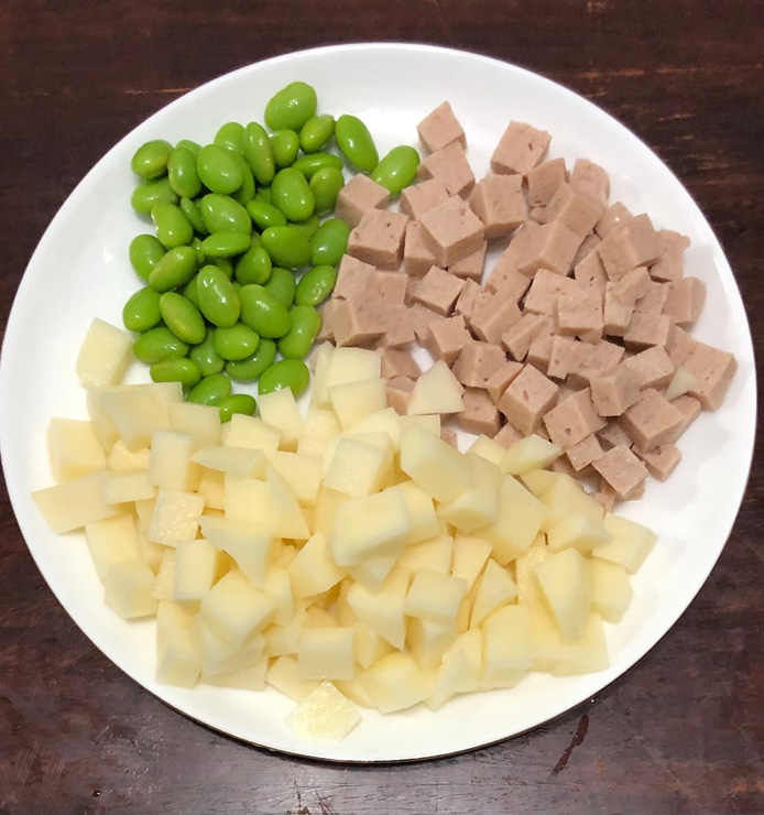 材料:馬鈴薯、毛豆、素火腿、沙茶醬、素毫油、鹽。