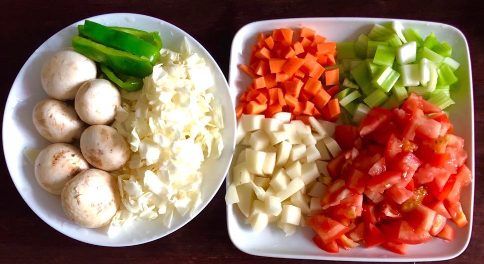 材料:西芹、馬鈴薯、番茄、紅羅蔔、髙麗菜、青椒、磨菇、黑胡椒碎粒、沙茶醬、橄欖油、鹽。