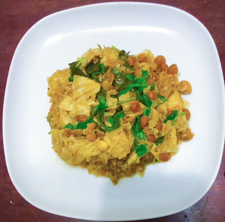 作法:先將破布仔掰開成小塊,豆包切小方塊,鍋内放油下破布仔炒香下豆包+兩滴素毫油拌炒+水煮滾+九層塔拌一下盛起即可。