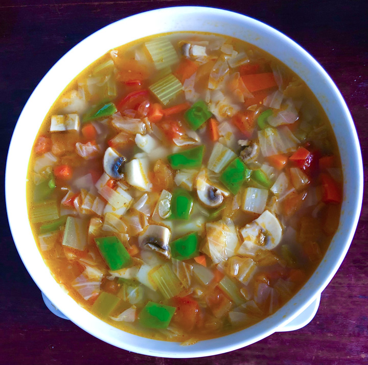 作法:鍋內放入橄欖油,下黑胡椒碎粒炒香+芹菜+紅蘿蔔+馬鈴薯拌炒+磨菇+番茄+沙茶醬+髙麗菜一起炒,倒入另一煮滾水湯鍋中燉煮到爛,把青椒切小塊放入炒鍋稍炒放在湯上即可。