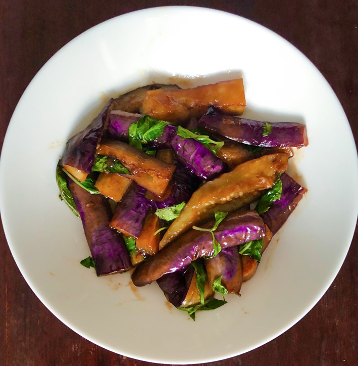 作法:鍋內放油再把茄子放下背朝下先煎一下再反面小火煎放少許水煮軟+醬油+烏醋+甜辣醬入味+九層塔即可盛起。