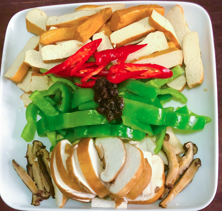 材料:青椒、豆乾、生香菇、乾香菇、紅辣椒、黑豆鼓、糖、和風醬油、鹽。