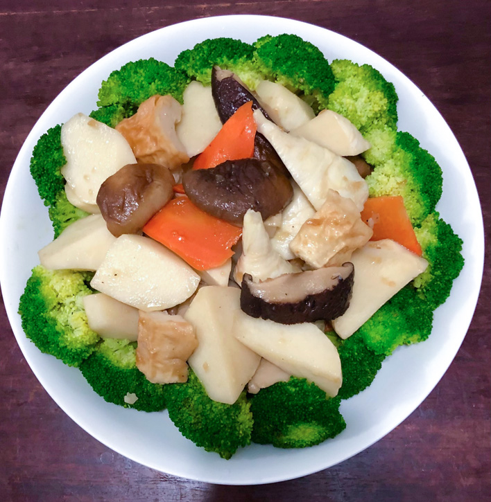 作法:先將綠花椰菜川燙排盤備用,香菇切成三片,筍切塊,紅蘿蔔切薄片,鍋内放油先將乾香菇煎香,再放入生香菇拌炒放少許鹽,再加入筍片紅蘿蔔片一起拌炒+和風醬油 (淡醬油)+水煮熟稍勾芡+香油,倒入排好盤的青花椰菜中即可。