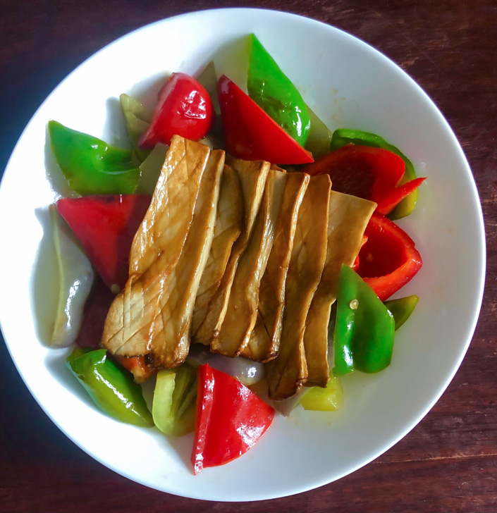 乾煎杏鮑菇 Posted on 2021-08-07 by malichuang 回應 材料:杏鲍菇、彩椒、鹽、胡椒鹽。作法:杏鮑菇切長片單面稍抹鹽備用,彩椒切滾刀。鍋放油下彩椒炒熟放鹽盛起舖盤,鍋放少許油放下杏鮑菇煎兩面黃盛起,排放彩椒上撒少許胡椒鹽即可。