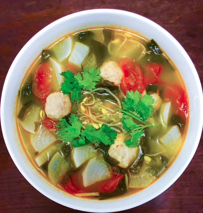 蘿蔔番茄海帶湯 Posted on 2021-08-07 by malichuang 回應 材料:蘿蔔、番茄、海帶、黃豆芽、素丸子、薑、香油。作法:把海帶泡開洗淨切段,番茄切片,蘿蔔切片,薑切絲。先將湯鍋放水下蘿蔔煮滾+黃豆芽一起燉煮,炒鍋放香油下薑絲炒香+海帶炒到粘+番茄炒出茄紅素放入湯鍋中+素丸子燉煮 20 分起鍋。