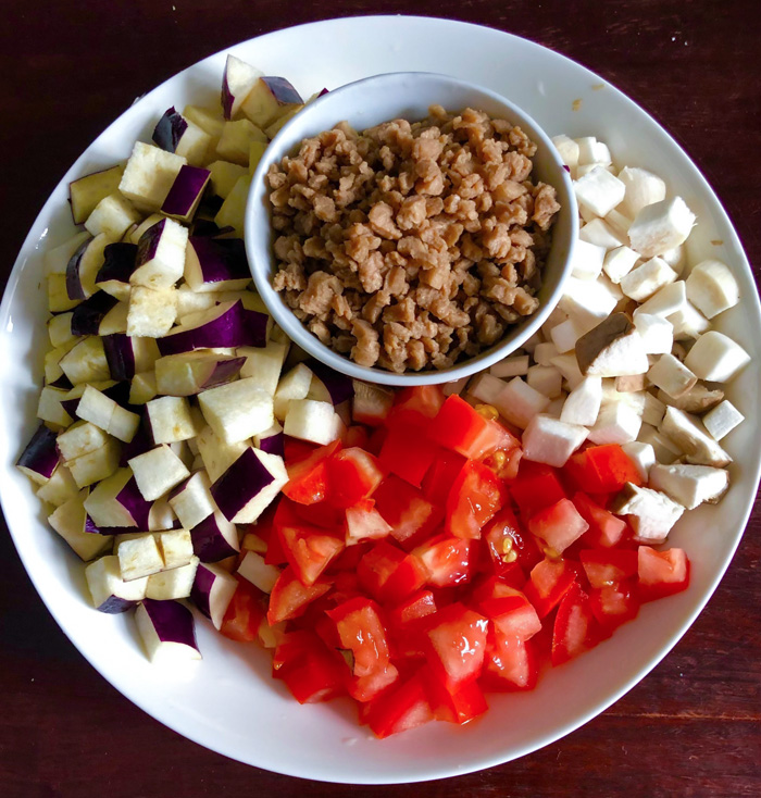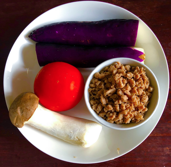 材料:素碎肉、茄子、番茄、杏鮑菇、薑。