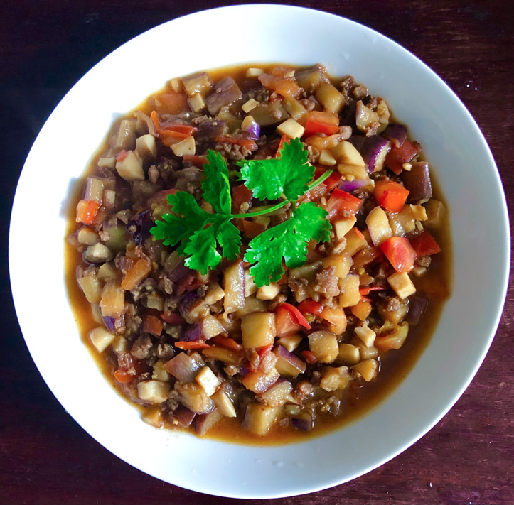 作法:先素碎肉泡軟備用。其他都切丁,2 片薑切末。將泡軟的素碎肉放鍋内,放油炒出它的香味後+薑末+杏鲍菇+少許鹽炒香盛起,鍋内放少許油下茄子炒軟+番茄+素毫油拌炒+水適量燜煮入味關火+香油即可。