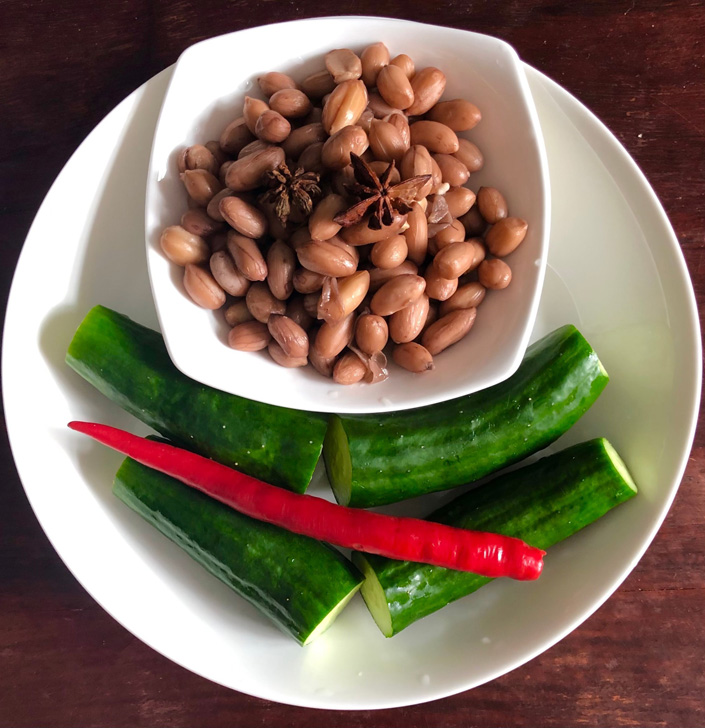 材料:花生、小黃瓜、紅辣椒、八角、花椒油。