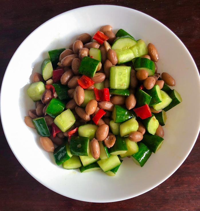作法:花生+八角+鹽煮熟備用,小黄瓜切成四片把仔稍切掉以免出水,切丁用少許鹽稍醃出水,鍋内放食油+花椒油下小黄瓜紅辣椒拌炒+熟花生+兩滴素毫油翻炒均匀盛起即可。