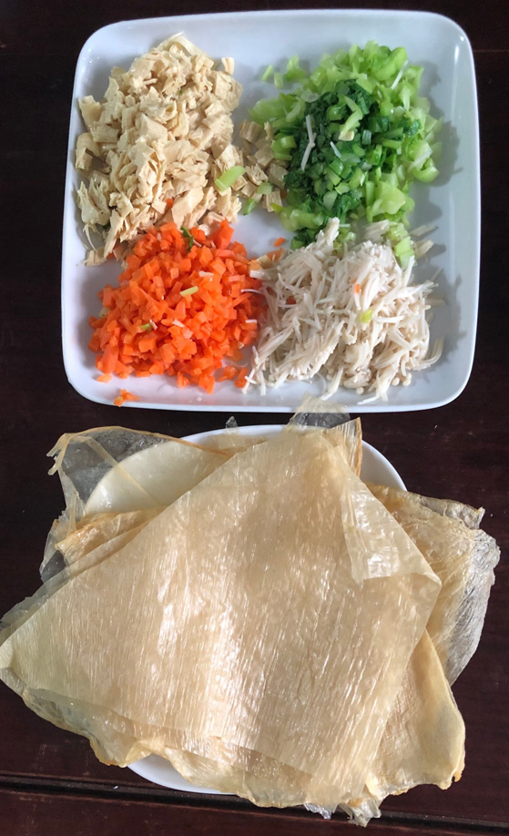 作法:豆皮分成六等分,把豆包切丁青江菜,紅蘿蔔、金針菇川燙切末,鍋內放下豆包炒香+其他一起放下拌炒+鹽+兩滴素毫油炒香成饀盛起備用。取豆皮一張+1 匙餡捲起打結 (如圖)全部完成油鍋燒熱,小火炸香撈起,白菜放入鍋中炒+鹽+素毫油放水煮軟放入炸好的素黄雀放入鍋中一起煮軟+芡即可盛起+香油。