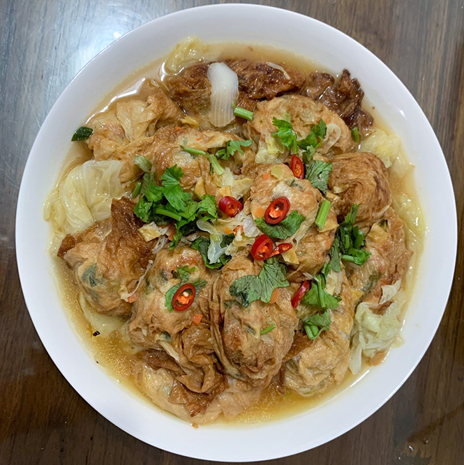 材料:豆皮、包心白菜、青江菜、紅蘿蔔、豆包、金針菇、鹽、素毫油、芡粉、香油。