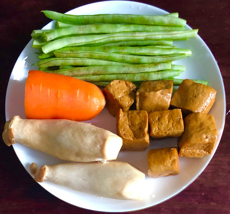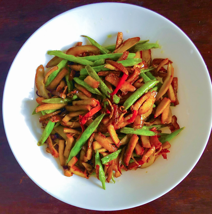 四季豆炒香干 Posted on 2021-09-07 by malichuang 回應 材料:四季豆、豆干、杏鲍菇、紅蘿蔔、嫩薑、沙茶醬、冰糖、薄醬油。作法:四季豆斜切,紅蘿蔔切絲,豆干切絲,薑切絲,杏鮑菇切斜片川燙備用,鍋放油下薑絲,杏鮑菇+冰糖少許+紅蘿蔔炒香+豆干絲+鹽炒香後盛起,放油下四季豆干煸至香再倒入豆干絲等+沙茶+薄醬油一起拌炒入味即可。