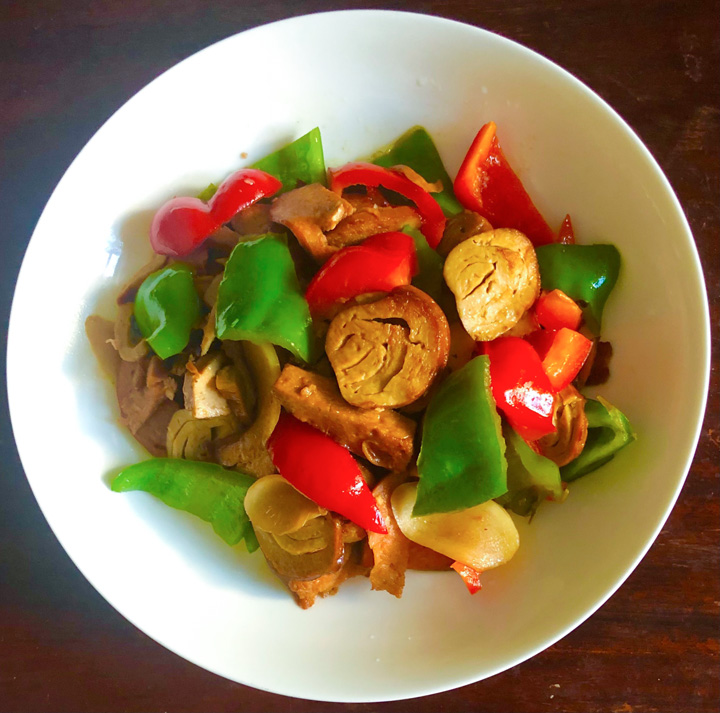 作法: 豆几、豆干切片,素火腿切片,彩椒切小滾刀,薑切片。鍋內放香油下薑片、豆几、豆干、素火腿炒香+鹽+醬油+糖炒並入味+彩椒拌炒+少許水燜煮水乾即可盛起。