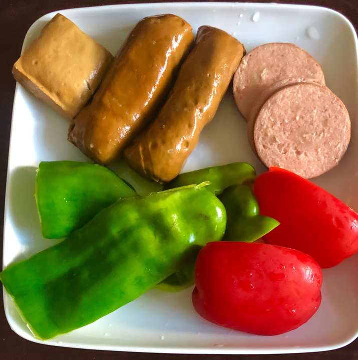 材料:豆几、豆干、素火腿、彩椒、嫩薑。
