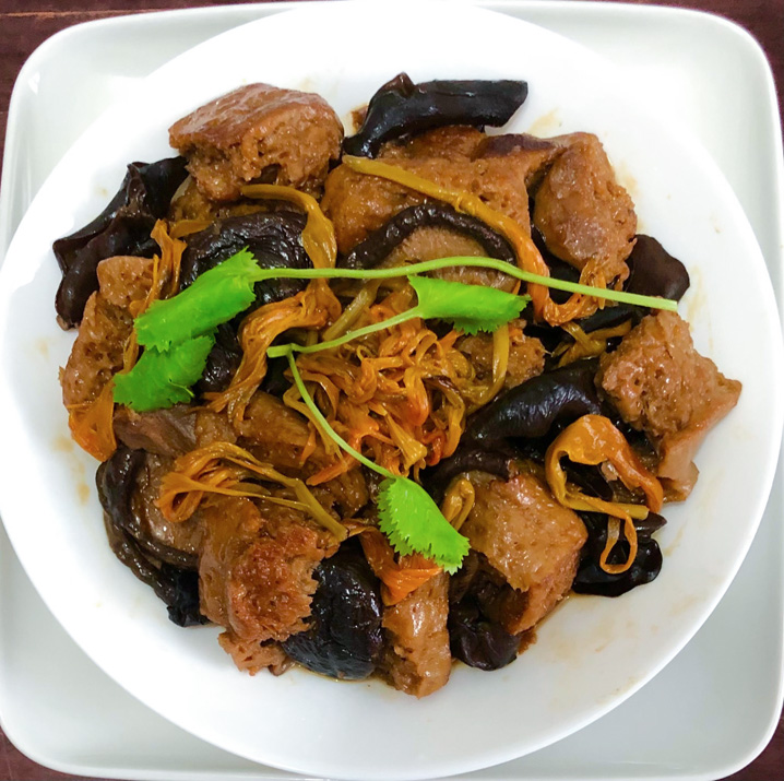 作法:先將烤麩川燙擠乾撕片煎兩面黃 (詳細作法請看記事本),木耳泡開煮滾撈起,金針洗淨泡軟,香菇泡軟切片,鍋內放少許油下香菇煎香+木耳+金針及已煎好的烤麩+醤油+糖+少許番茄醬拌炒+水蓋滿料,蓋上鍋蓋中小火燜燒至乾水盛起即可。