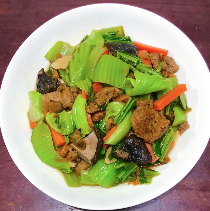 芥菜炒烤麩 Posted on 2021-11-14 by malichuang 回應 材料:芥菜、紅蘿蔔、滷烤麩、薑。作法:芥菜洗淨切片段,薑切片,鍋內放油下薑片炒香+芥菜+鹽炒軟+滷烤麩+少許水拌炒至入味即可盛起。 備註:滷烤麩可事先燒多點放冰箱,要用時取出和各種蔬菜搭配成一道簡易的料理。