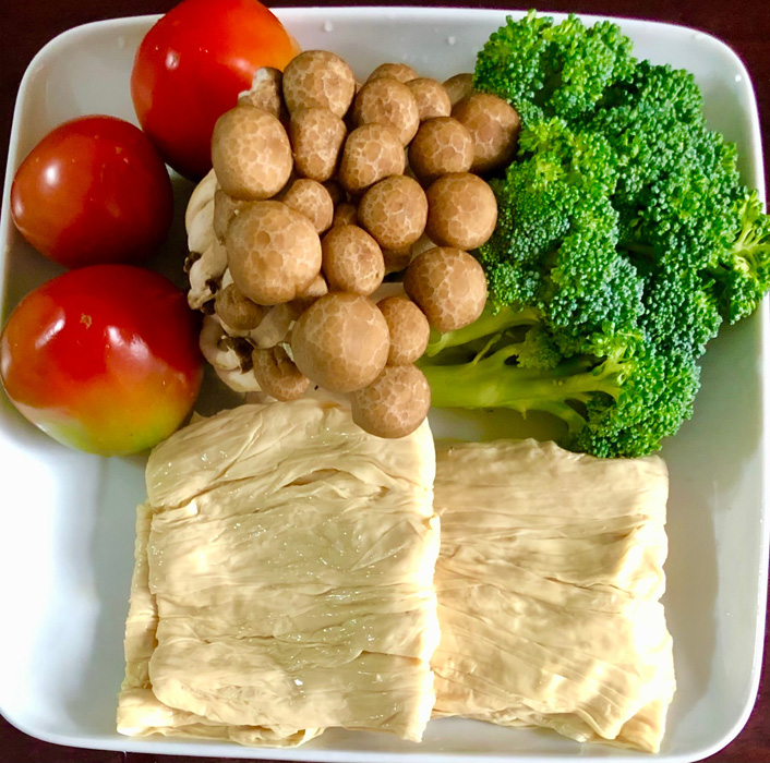 材料:豆包、番茄、鴻喜菇、綠花椰菜、薑、胡椒粉、醬油、番茄醬。