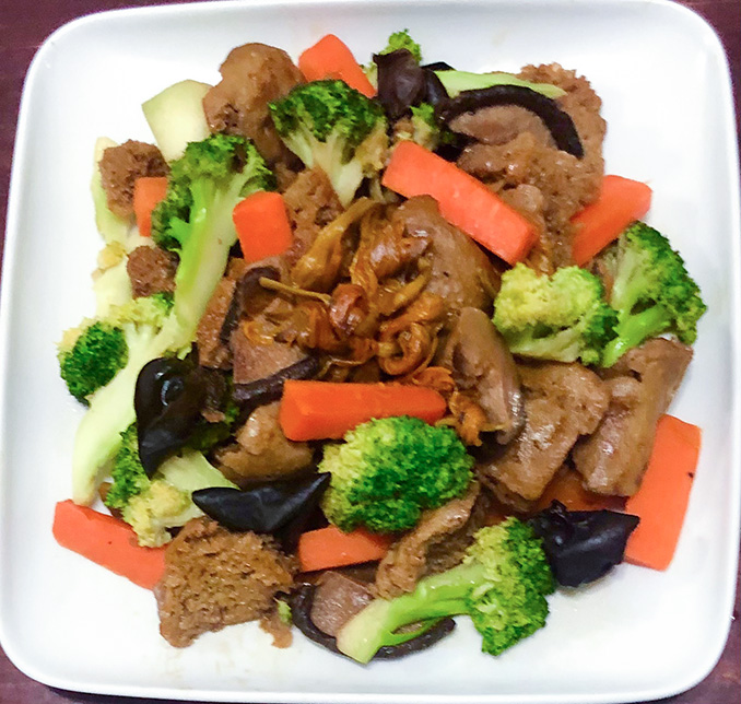 作法: 先將烤麩洗淨切片,香菇切片,木耳煮好備用,金針洗好打結,蔬菜切好川燙,先將烤麩煎兩面黃+香菇炒香+木耳+金針+醬油+糖炒香+水蓋過面,煮至水稍少+已汆燙好的蔬菜+胡椒鹽拌炒入味即可。