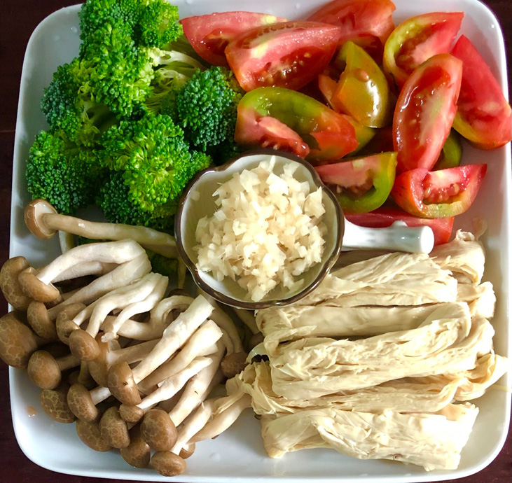 材料:烤麩、香菇、木耳、金針、綠花椰菜、紅蘿蔔。