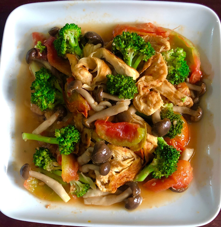 作法:先把綠花椰菜、菇川燙備用,再鍋內放油把豆包煎香,放一旁+薑末+少許油炒香+豆包番茄+醤油+少許番茄醬+川燙好的花椰菜、菇+胡椒粉一起拌炒+少許水煮入味即可。