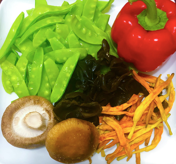 材料:荷蘭豆、紅彩椒、金針、生香菇、木耳、薑。