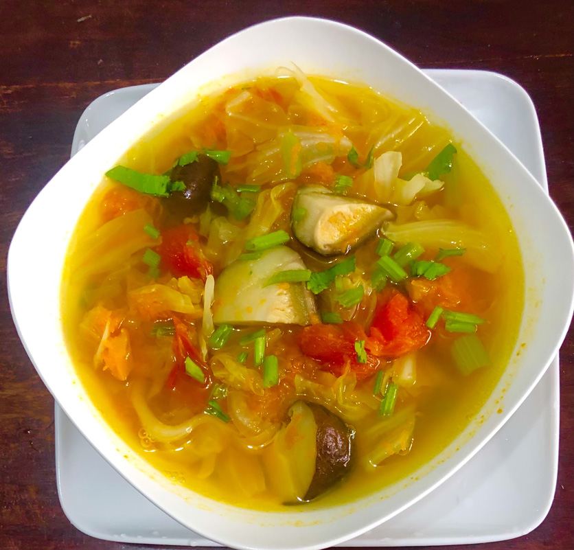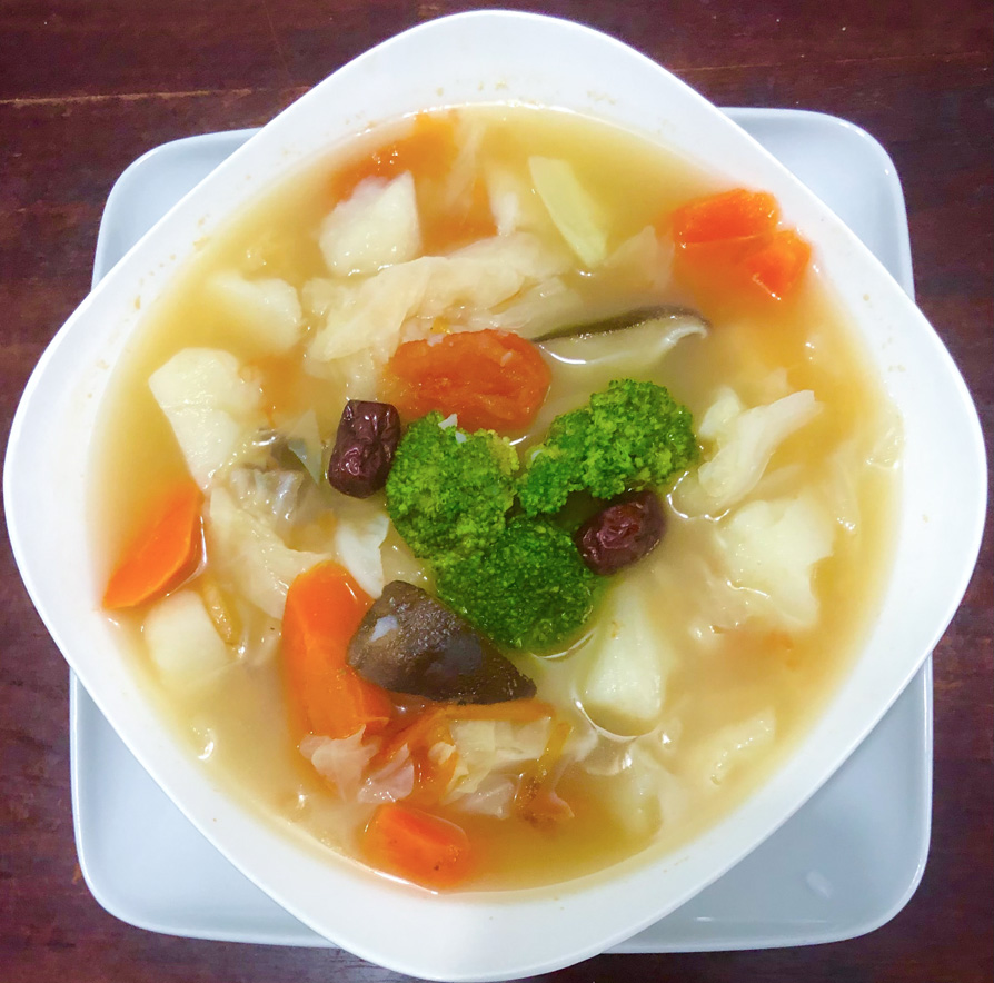 作法:先將南瓜番茄生香菇切塊,髙麗菜撕片再煮一鍋水+薑片煮滾放進所有蔬菜燉煮至熟軟+胡椒鹽,綠花椰菜最後配色用即可食用。