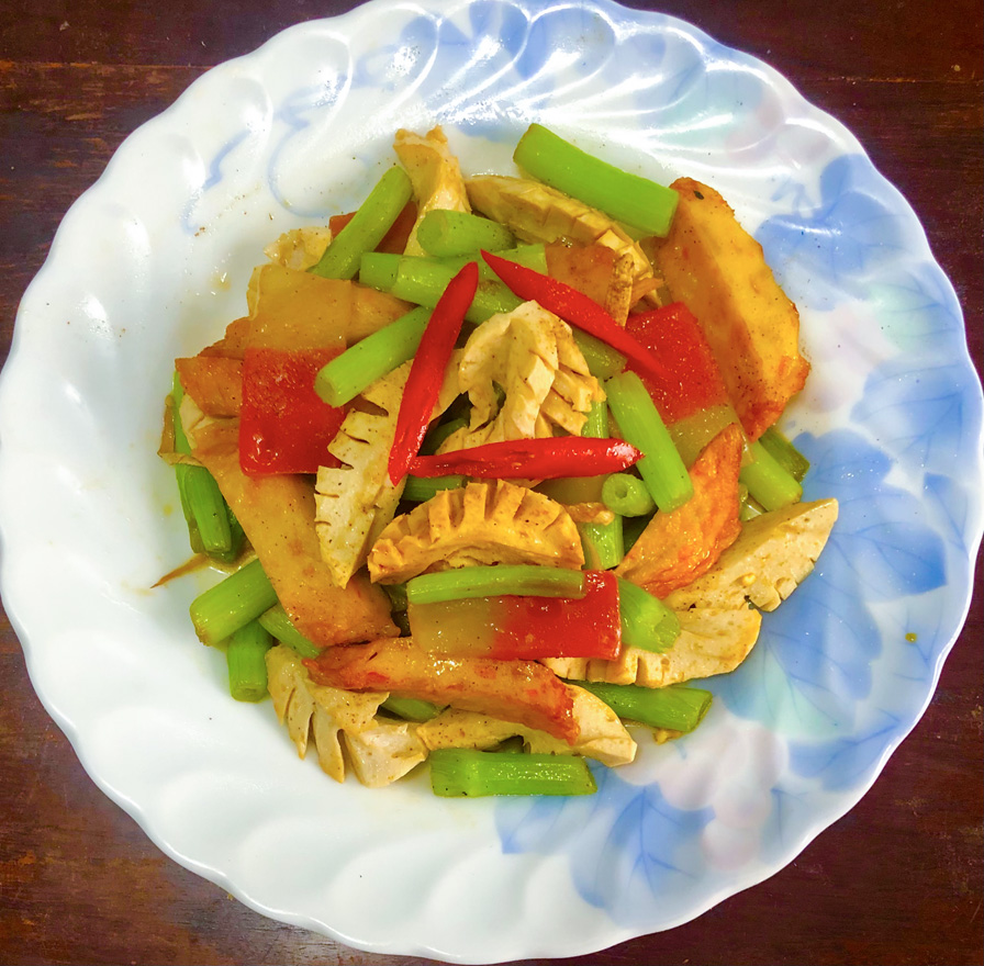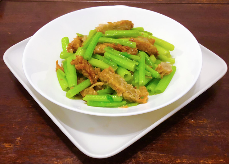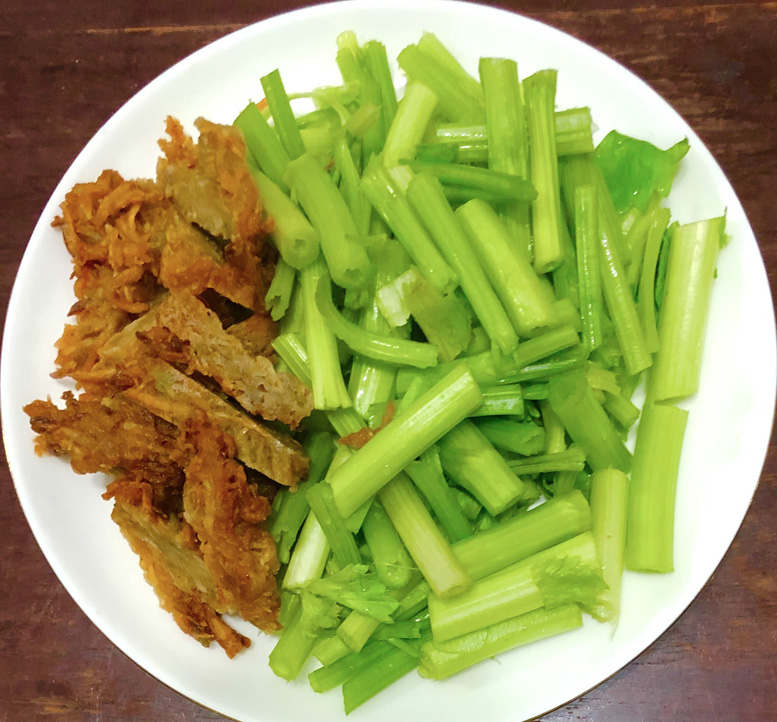 作法:芹菜洗淨去葉只留梗切小段,牛膀餅切成三片,鍋內放油牛膀片炒香,下芹菜+胡椒鹽+少許水拌炒至熟即可。