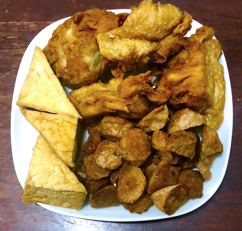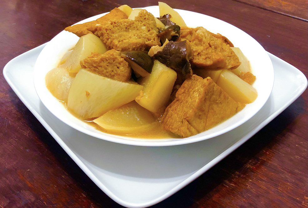 作法:蘿蔔切滾刀,鍋放少许油把香菇煎香,放入蘿蔔+炸好的烤麩,油豆腐+素毫油+鹽炒香+水蓋過面燉至蘿蔔軟即可。
