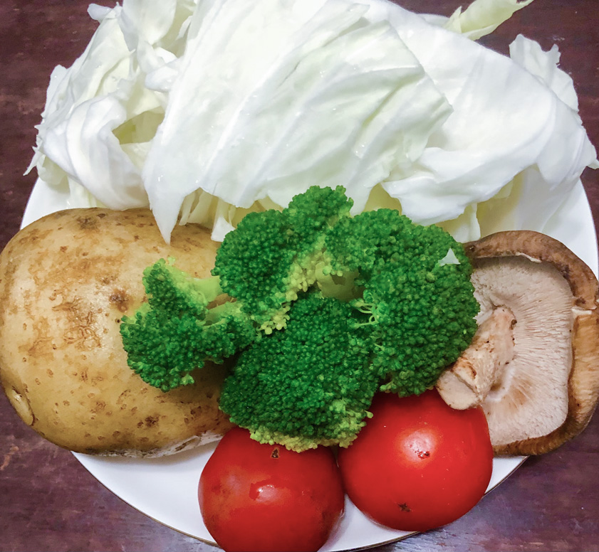 材料:馬鈴薯、番茄、生香菇、高麗菜、紅蘿葡、綠花椰菜、紅棗、味噌。