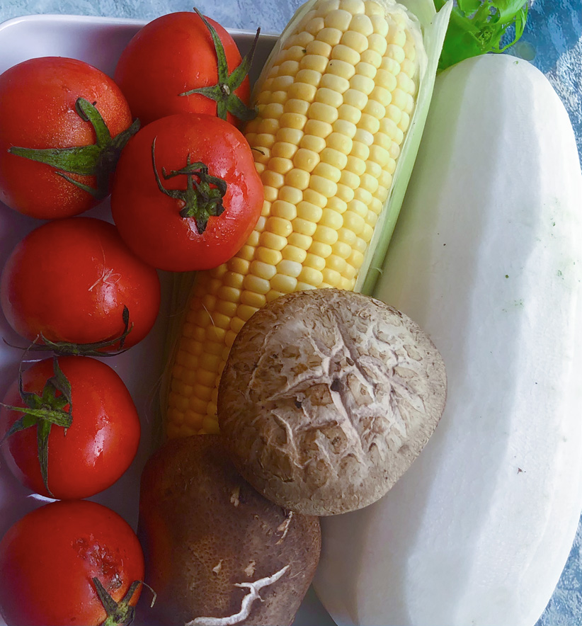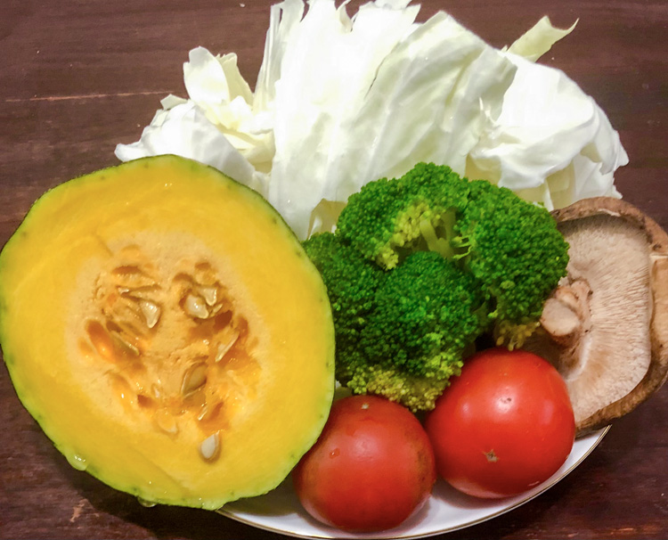 材料:南瓜、番茄、生香菇、高麗菜、花椰菜、薑、鹽、胡椒粉、橄欖油。