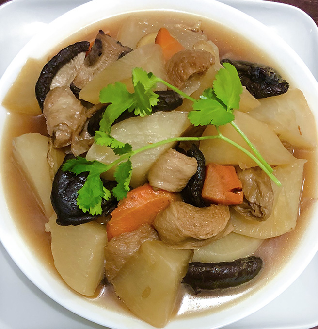 作法:白蘿蔔切滾刀,川燙備用,香菇切四片,麵輪煮過切三片,紅蘿蔔少許,鍋內放油下薑片煎香+香菇紅蘿蔔炒香+麵輪炒+醬油素毫油+少許鹽+白蘿蔔拌炒+水蓋過面蓋上鍋蓋燉至蘿蔔熟軟入味即可享用。