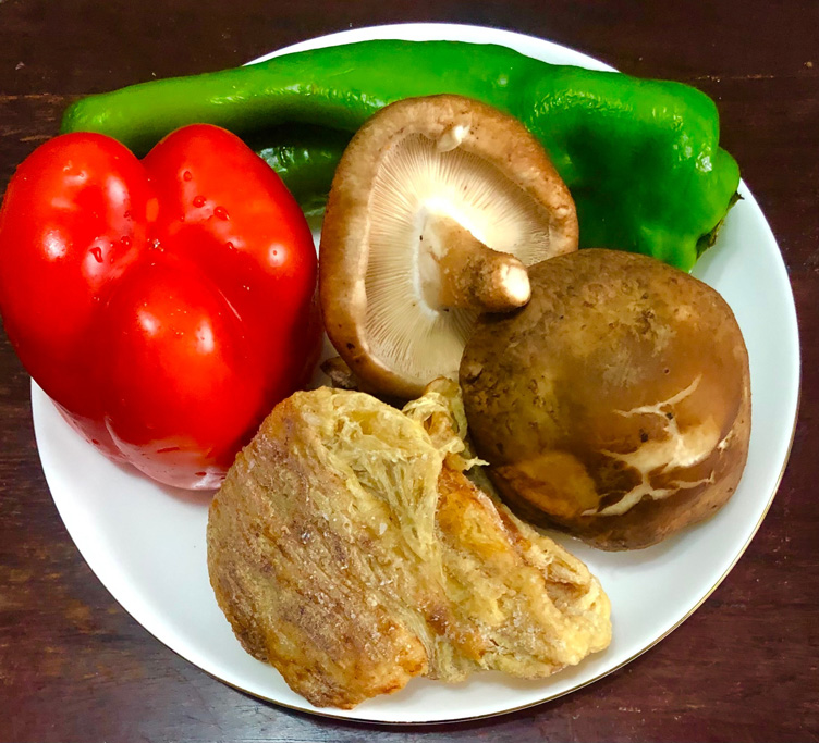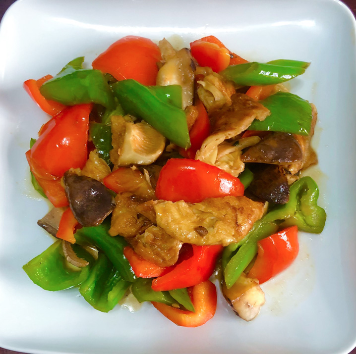 作法:先將彩椒洗切滾刀稍川燙備用。把豆包煎香切片,生香菇洗淨切片鍋内放油下薑+生香菇炒香+豆包拌炒+素毫油+青红彩椒+胡椒鹽翻炒+甜辣醤拌炒即可盛起。