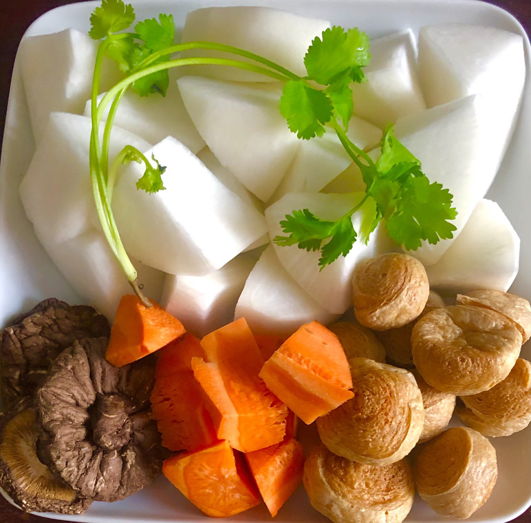 材料:白蘿蔔、香菇、生香菇、烤麩、油豆腐、素毫油、鹽、糖。