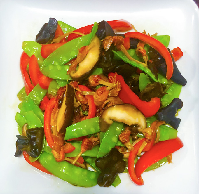 作法:荷蘭豆摘頭尾洗淨,紅彩椒切條狀,木耳泡好,金針打結,以上都川燙過水備用。生香菇切片,薑切絲,鍋內放油下薑炒+生香菇炒香+川燙好的蔬菜一起放入+鹽+醬油少許拌炒入味即可盛起。