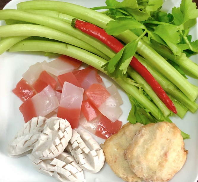 材料:蒟蒻、素腰花、甜不辣、芹菜。