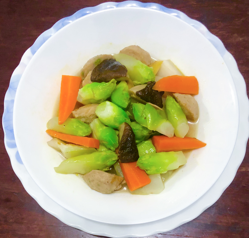 作法:將娃娃菜削去老皮,紅蘿蔔切片,香菇切成四片,丸子切半,薑切絲,鍋内放油下薑絲炒香+香菇紅蘿蔔+少許鹽炒出紅蘿蔔素+娃娃菜素丸子+水煮至娃娃菜熟+胡椒鹽即可盛起。