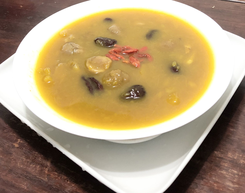 作法:先將南瓜去皮切塊,粟子、紅棗、薑兩片都洗淨,除枸杞外其他材料都放入鍋中加水大火煮滾,開小火燉至熟,依綿稠喜歡程度 (一小時以上)+鹽即可盛起,加少許枸杞點綴即可。