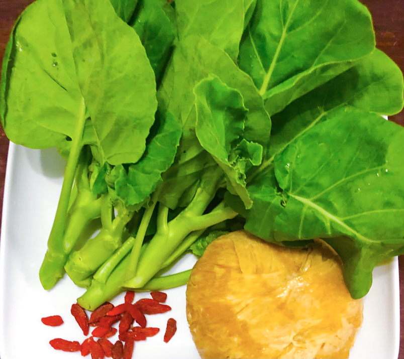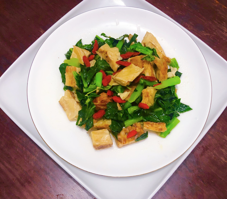 作法:先將青菜洗淨川燙+少許油撈起備用。豆包切小方塊,鍋内放油下薑絲炒香+豆包+川燙好的芥藍拌炒+鹽+料酒少許,撒上枸杞起鍋。