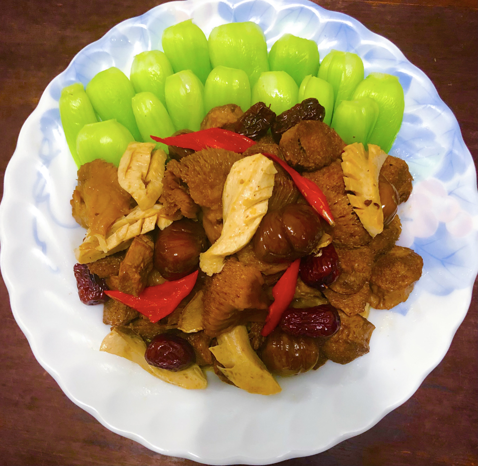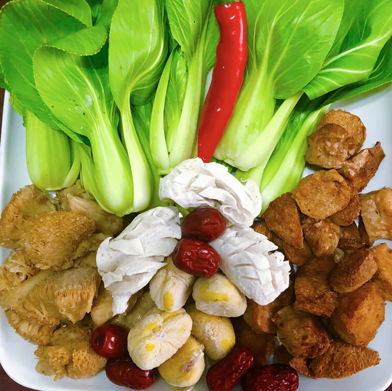材料:猴頭菇、素肉角、粟子、素腰花、紅棗、青江菜、紅辣椒、薑。